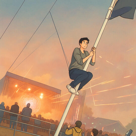 Twenty years he's been pulling this. Drumsheds, post-Covid lockdown, Pendulum playing. I turned around and he was up a flagpole. Security furious. He slid down as the beat dropped, gave them the full drunk Hugh Grant apology routine, then disappeared into the crowd like smoke. Poof. Three hours later, a saint of a woman rang from his phone having found him semi-concious wallowing in self-pity and loathing. He was miles away. Typical.